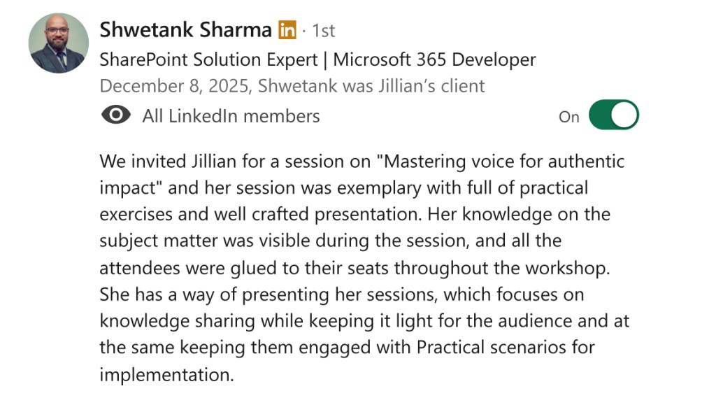 “Jill was an invaluable voice coach during my TEDx journey. Her calm presence and supportive guidance created the space I needed to refine my message and deliver it with clarity. She not only helped me articulate my ideas with precision but also protected and strengthened my voice throughout the process. Jill’s expertise and kindness made her a joy to work with, and I know her coaching directly contributed to the success of my TEDx talk.“