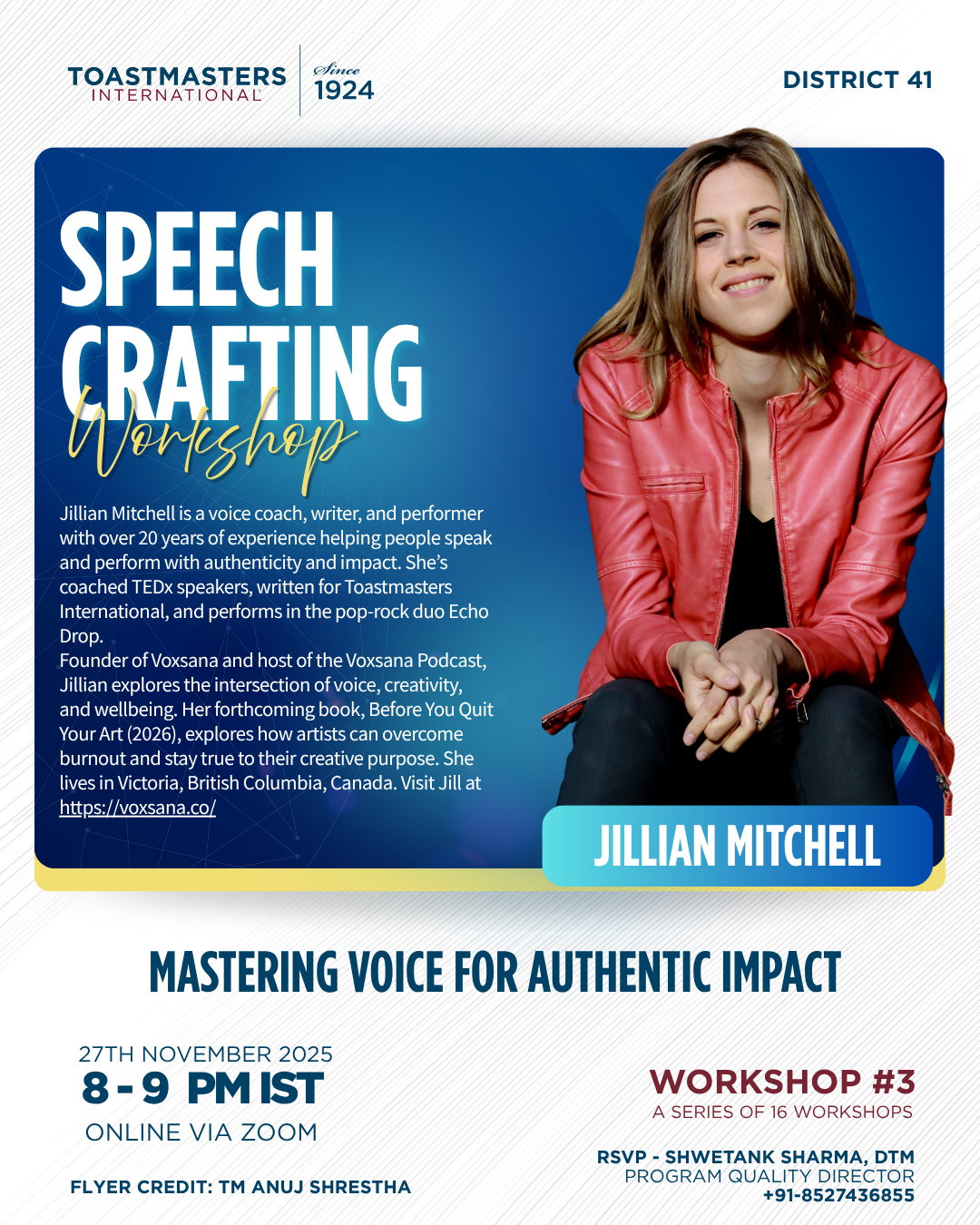 “Jillian has participated on the TEDxRRU speaker coaching team for multiple years which has included leading workshops, collaborating with fellow coaches and in one-on-one settings and has been involved throughout every stage of the process from initial auditions through to event day. Jillian’s specialization in voice coaching was particularly impactful. She helped speakers develop deeper awareness of their voices and provided guided techniques and practical tools to support their growth. Her work helped speakers embody their message with clarity and presence, creating an experience that resonated more deeply with audiences. She brings artistry, precision, and genuine care to her work.”